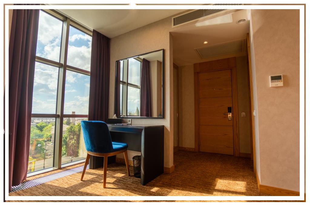 Удобства в номерах: Сейф, Кондиционер, Телевизор, Мини-бар, Телефон, Душ