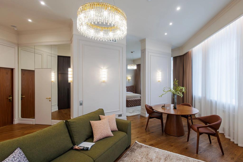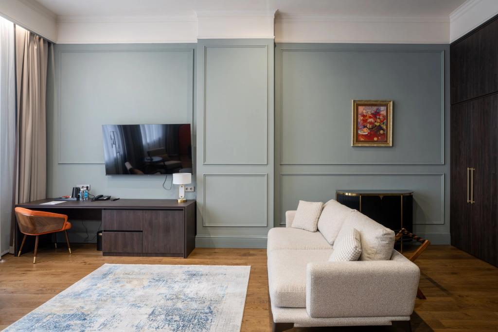 Удобства в номерах: Сейф, Кондиционер, Телевизор, Холодильник, Мини-бар, Телефон, Душ, Кухня