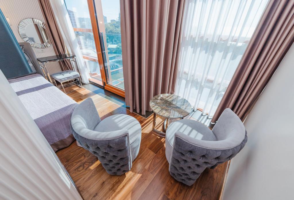 Удобства в номерах: Сейф, Кондиционер, Телевизор, Холодильник, Телефон, Душ, Кухня